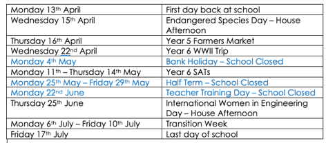 Dates for your diaries – Summer term Trips – unless otherwise informed by the class teacher, uniforms must be worn on all school trips.